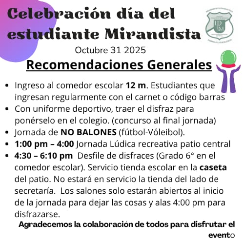 “La Rectoría del Colegio Francisco de Miranda IED, informa a la Comunidad Educativa, que el próximo miércoles 25 de mayo de 2022, los estudiantes no tendrán clases, debido a que la Secretaría de Educación Distrital, ha convocado a todos los docentes al evento de conmemoración del ‘Día de las maestras y los maestros’ y el viernes 27 de mayo y sábado 28 de mayo (Estudiantes Estrategia A-probar y Banda de Marcha) tampoco asistirán a clases, debido a que el Colegio es puesto de votación y por determinación de la Registraduría Nacional del Estado Civil y la Secretaría de Educación, las instalaciones deben estar dispuesta desde el viernes anterior a las elecciones para la organización de la jornada electoral”