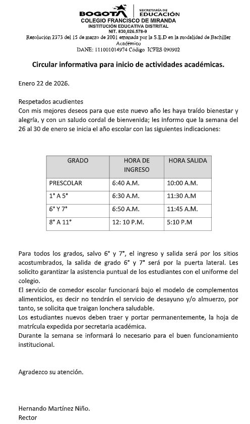 “La Rectoría del Colegio Francisco de Miranda IED, informa a la Comunidad Educativa, que de acuerdo a lo establecido en la Circular No. 001 de ener-2023 la Secretaria de Educación Distrital ha convocado a los docentes y directivos docentes a la segunda Jornada Pedagógica Distrital el próximo martes 16 de mayo de 2023, motivo por el cual los estudiantes no asistirán al colegio ese día; y para el miércoles siguiente corresponden las clases del día 2.